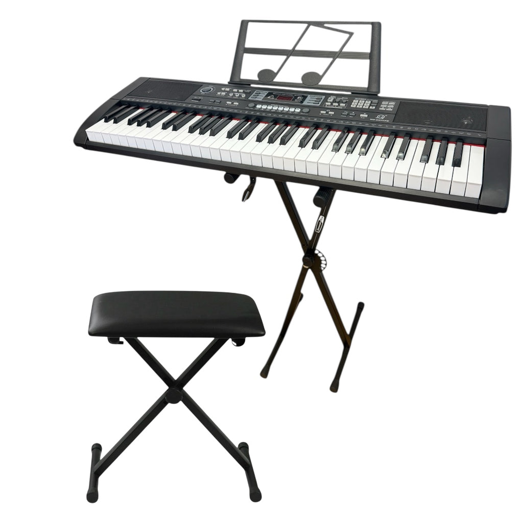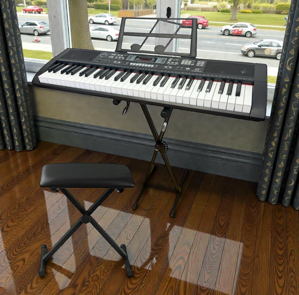 Start your musical journey with this 61-Key Electric Keyboard Piano Bundle, designed for beginners, students, and home musicians. Featuring full-size keys, built-in speakers, rich tones, rhythm styles, and a microphone input, this all-in-one bundle lets you play, sing, and learn instantly. Includes a sturdy keyboard stand and microphone โ no extra accessories needed.