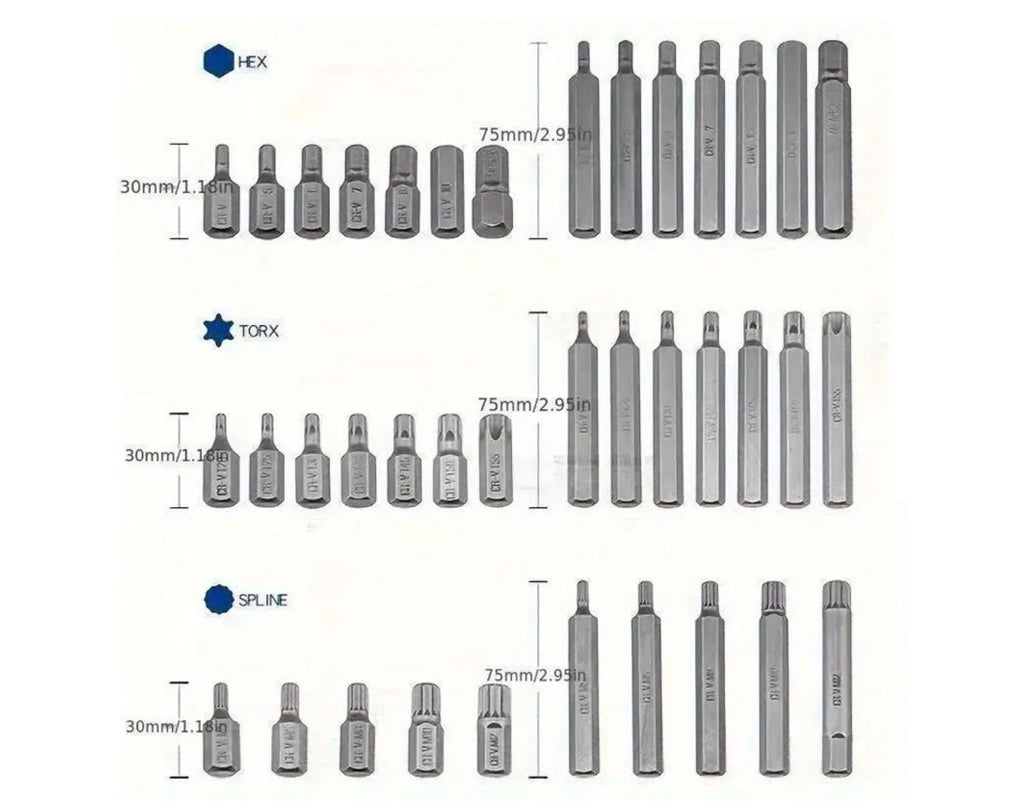 - Set of 40 Hex, Torx, and Spline bits made from durable Alloy Steel.